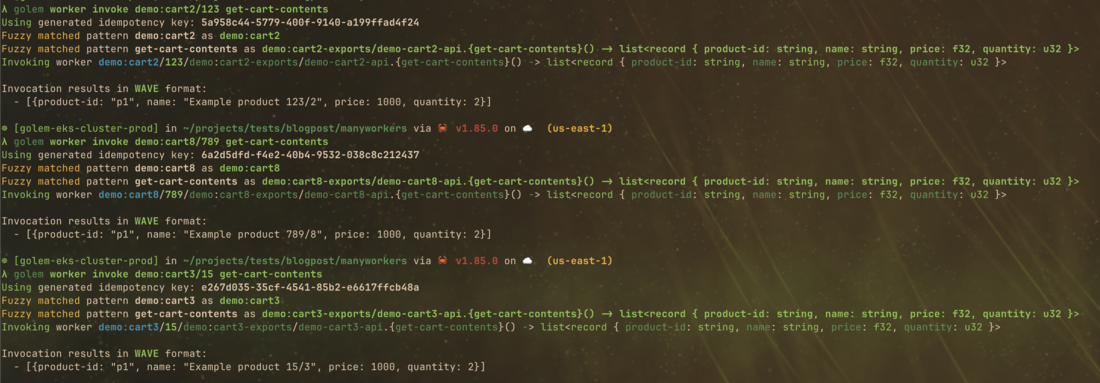 golem worker invoke $"demo:cart($i)/($j)" initialize-cart '"user1"';